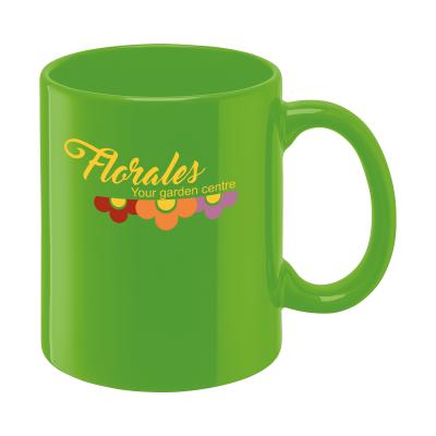 Cambridge style mug with your choice of pantone colour applied to the entire outer of the mug. Now certified dishwasher proof! Decorated with a screen over print. Co-ordinated packaging also available, ask for more information.