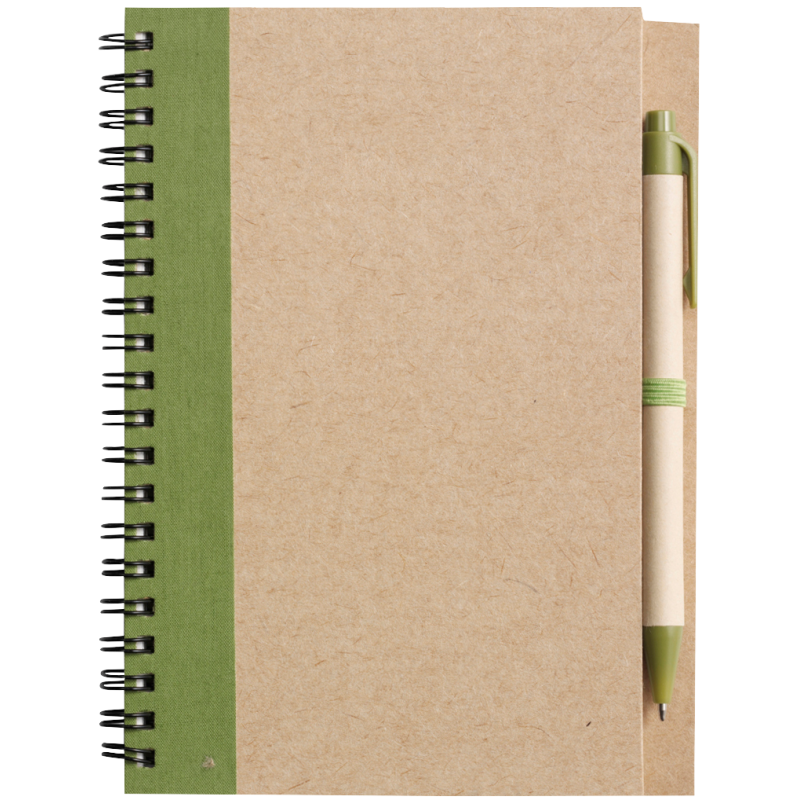 Wire bound notebook with ballpen, and approx. sixty pages made from 100% recycled paper and a bio fabric coloured material. Includes a pen with biodegradable parts and blue ink.